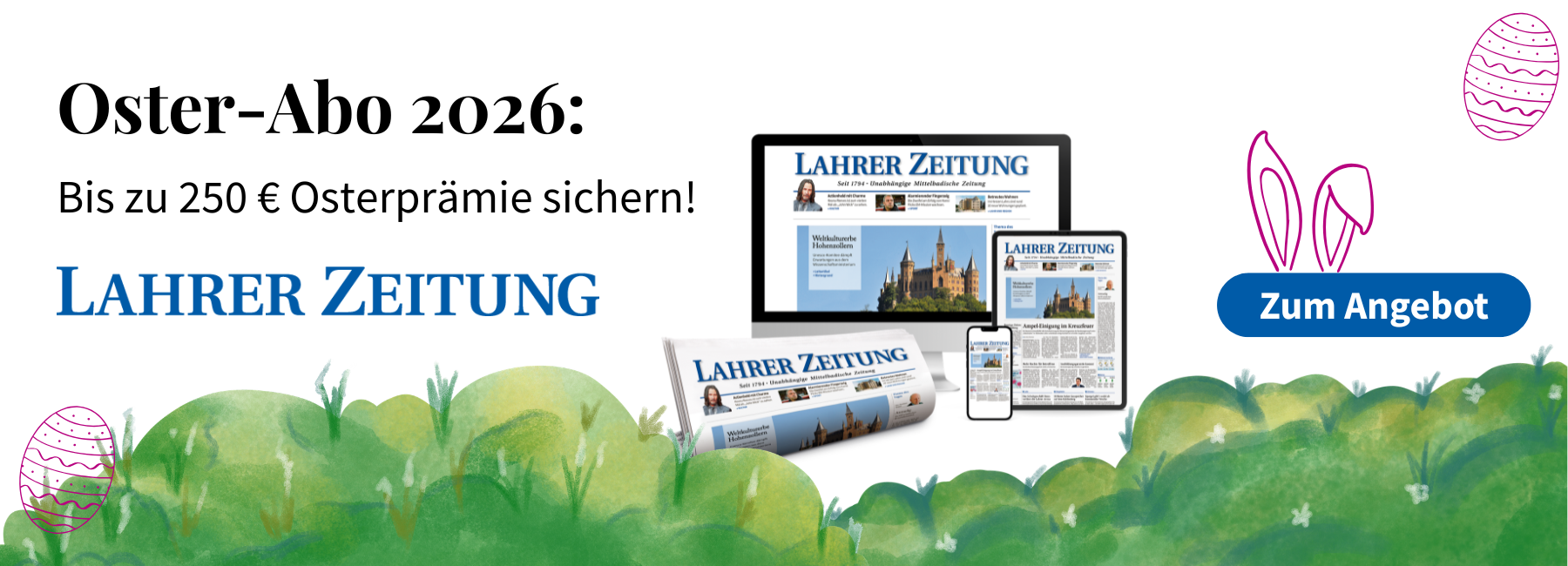 Die Inanspruchnahme dieses Angebots ist nur innerhalb Deutschlands und einmal pro Haushalt möglich. Das Angebot kann nicht gewährt werden, wenn mit der Bestellung eine Kündigung verbunden ist. Die Laufzeit des Digitalpakets beträgt 24 Monate, anschließend ist das Digital-Abo mit einer Frist von einem (1) Monat kündbar. Print-Abonnenten erhalten einen Vorteilspreis ab 10,00 € mtl. Dieser erscheint nach Login bzw. bei Registrierung und Verknüpfung mit Ihrer Kundennummer und gilt nur in Verbindung mit einem Print-Abonnement der Lahrer Zeitung. Vor Vertragsabschluss und vor Freischaltung wird eine Bonitätsprüfung durchgeführt. Bitte rechnen Sie mit einer Lieferzeit von ca. 2 Wochen. Das Gerät wird ausschließlich an den Besteller ausgehändigt und die Zuzahlung wird mit der ersten Abo-Gebühr abgebucht. Preisstand: 01.01.2026